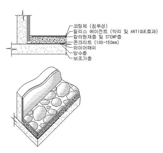 2) 시공순서 (1) 준비작업 - 비닐보양 (2) 콘크리트 타설(현장 책임) 및 면고르기 (3) 패턴크리트 원재 1차 살포 - 70% (4) 1차 미장 (5) 패턴크리트 원재 2차 살포 - 30% (6) 2차 미장 (7) 릴리스 살포 - 박리제 (8) 지정된 모양 스템프 작업 (9) 표면 양생 : 24~48시간 (10) 콘크리트 앙생 기간 (약여름 3-5, 겨울8-10일) (11) 물청소 (12) 건조 (13) 크리어씰 코팅 및 코킹 작업 (14) 보양 - 표면 보호